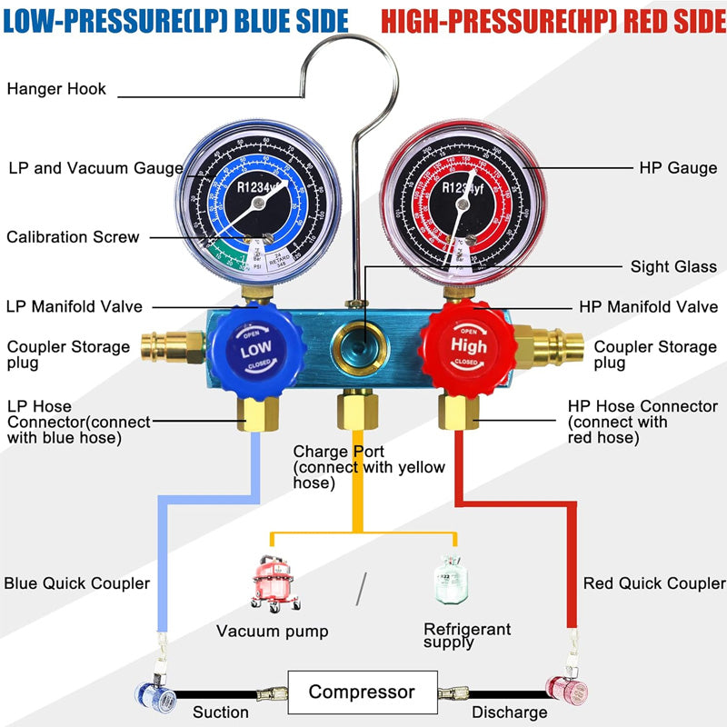 MĂTARE MED HĂG PRECISION: 3-vĂ€gs 2-ventils R134 AC-mĂ€taruppsĂ€ttning har en stor och fĂ€rgad mĂ€tare som Ă€r lĂ€tt att lĂ€sa av. Siktfönstret pĂ„ grenröret gör det lĂ€ttare att se köldmediets status. Inbyggda kalibreringsskruvar och en hoppfri pekare möjliggör noggrann mĂ€tning och realtidsvisning av systemtrycket.