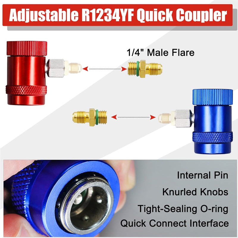 JUSTERBARA SNABBKOPPLINGAR VALVE CORE REMOVER:R134 snabbkopplingsadaptrar har mÀssingsmaterial som Àr robust och pÄlitligt. Med ett exakt snÀpplÄs och en halkskyddad rÀfflad greppring Àr den lÀtt att ansluta och koppla bort och kompatibel med alla modellers serviceportar. Röd för högt tryck, blÄ för lÄgt tryck. 1 st verktyg för borttagning av ventilkÀrna för bildÀck, design med dubbla huvuden, bra verktyg för byte och underhÄll av bilens luftkonditionering.
