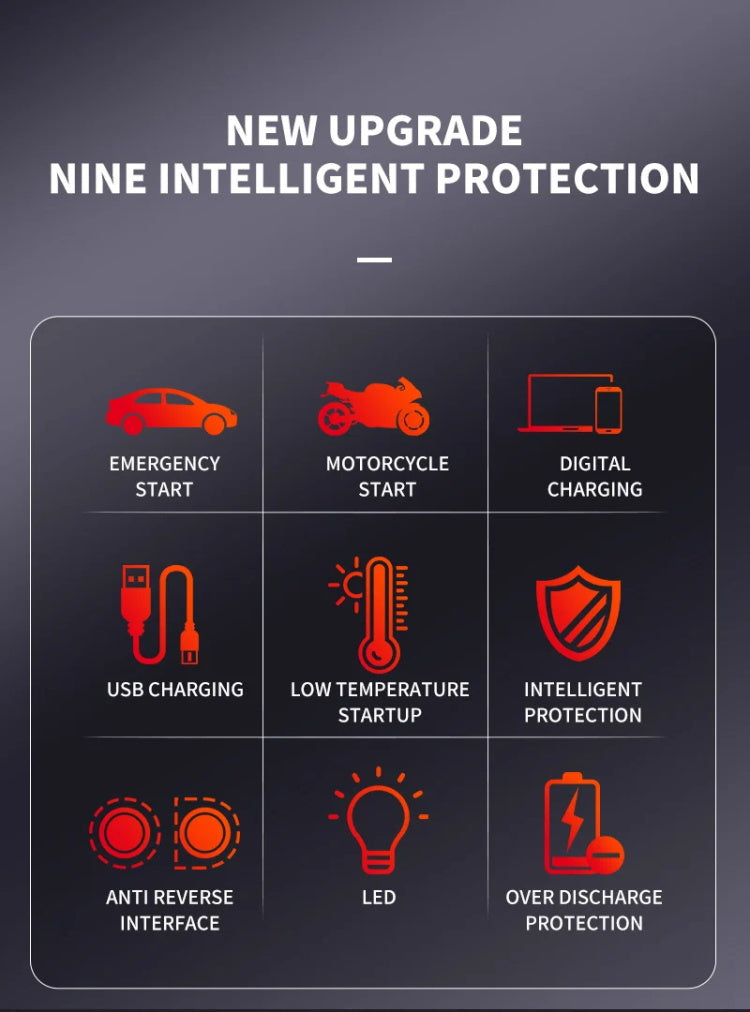 Säker, snabb och pålitlig starthjälp: Är du trött på besväret med ett urladdat bil- eller motorcykelbatteri? Tänk dig att kunna starta din bil när som helst och var som helst utan att vara beroende av andras hjälp eller vänta på vägassistans. Den bärbara starthjälpen blåser nytt liv i ditt urladdade batteri inom några sekunder.