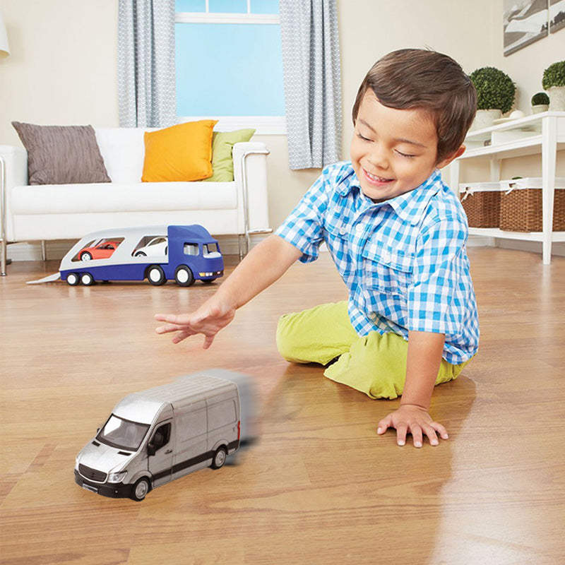 PULL BACK ACTION FUN- BÄda sidodörrarna kan öppnas, hjulen kan vridas flexibelt och bakhjulen ÄterfÄr kraftfunktionen. Dra helt enkelt minibilen bakÄt och slÀpp den för att se den köra framÄt, vilket gör leken Ànnu roligare.