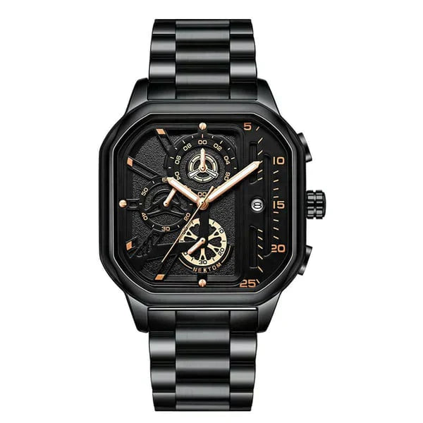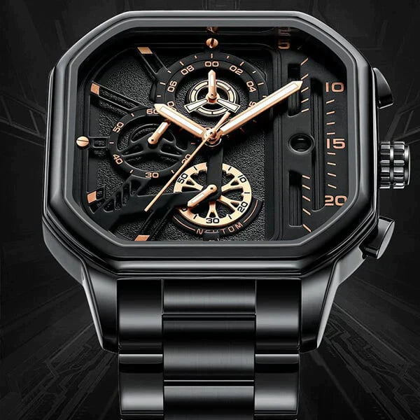 Unik modedesign: Ramen antar den Ättkantiga designen. En spegelpolering pÄ sidorna ger ramen en fin glans. Tim- och minutvisarna Àr fyllda med vitt ljus. Den svartplÀterade boetten i rostfritt stÄl med en 42,5 mm urtavla Àr perfekt för större manliga handleder.