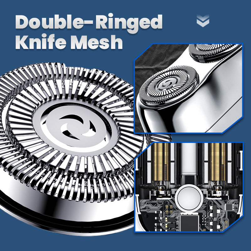 VASSA BLAD MED CIRKULÄR BÅGE: Rakhyveln är utrustad med högpresterande, vassa roterande huvuden som säkerställer en jämn och exakt rakning och effektivt skär genom håret utan irritation.
