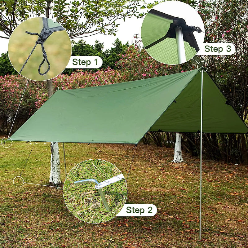 LÄTT ATT SÄTTA UPP - Taket kan enkelt fästas med professionella järnstänger, rep och fästspikar (ingår ej). Dessutom kan det stödjas av träd, vandringsstavar eller upprättstående pinnar, vilket ger mångsidiga installationsalternativ för utomhusbruk.