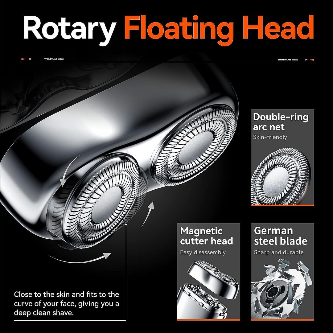 SkÀrpt rostfritt stÄl med virvelblad, anpassat för tufft skÀgg. 0,1 mm tunn folie i rostfritt stÄl, dubbla ringar med 3D-knivnÀt ökar rakvolymen, medan den flytande bÄgytan ger en smidig rakning och tar bort hÄr effektivt.