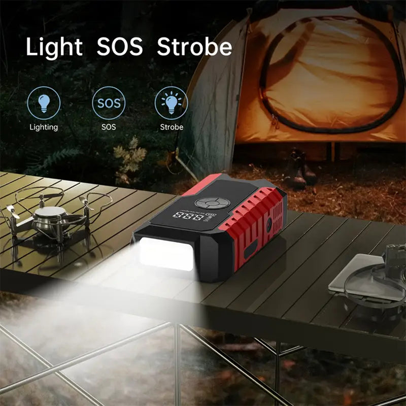 3-I-1 MULTIFUNKTIONELL ENHET: Denna kombination av startbooster, dÀckpump och powerbank Àr din allt-i-ett-lösning för nödsituationer. Starta urladdade batterier direkt, pumpa dÀck och ladda enheter nÀr du Àr pÄ sprÄng.