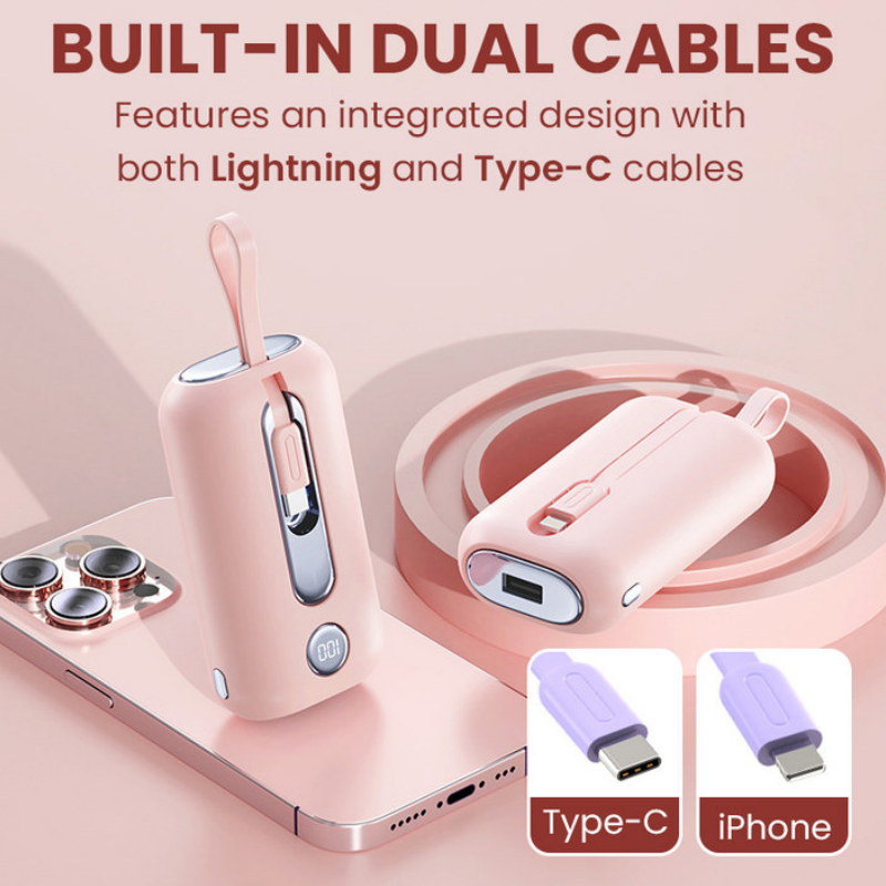 INBYGDA DUBBLA KABLAR: Har en integrerad design med bÄde Lightning- och Type-C-kablar som ocksÄ kan fungera som nyckelband, vilket eliminerar behovet av att bÀra med sig extra laddningskablar och ger bekvÀmlighet och kompatibilitet med olika enheter.