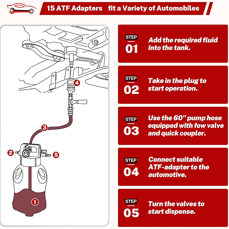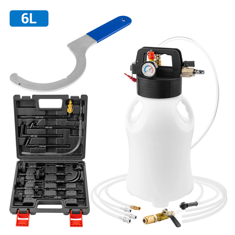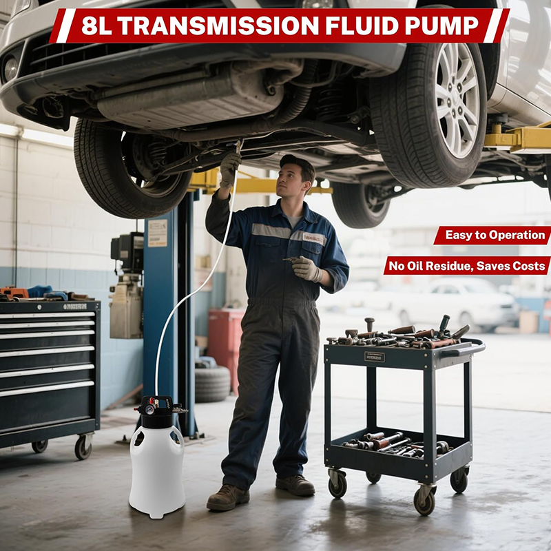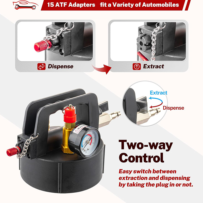 EFFEKTIV FLĂDESĂVERFĂRING: Den luftdrivna pumpen för överföring av transmissionsvĂ€tska sĂ€kerstĂ€ller snabb och effektiv överföring av transmissionsvĂ€tskor, vilket sparar vĂ€rdefull tid vid bilunderhĂ„ll. Dess kraftfulla luftdrivna mekanism Ă€r utformad för snabb vĂ€tskeförflyttning, vilket ökar produktiviteten för bĂ„de professionella mekaniker och hobbymekaniker.