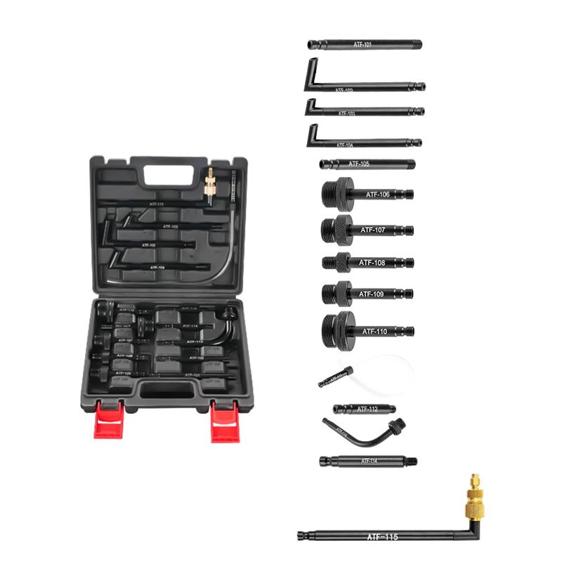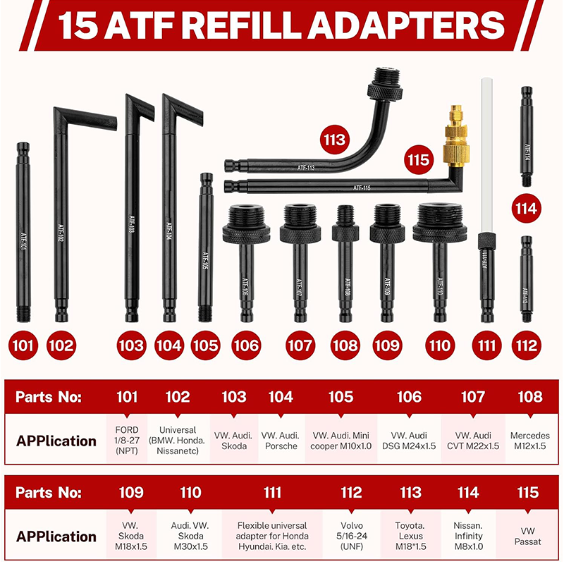 Mà NGSIDIGA ANSLUTNINGSALTERNATIV: Levereras med en rad olika kopplingar i aluminiumlegering för vÀxellÄdor, inklusive modeller som ATF - 107, ATF - 108 och fler. Dessa kopplingar Àr kompatibla med ett brett utbud av bilmÀrken och modeller. MÄngsidigheten eliminerar behovet av flera verktyg, vilket effektiviserar ditt arbetsflöde.