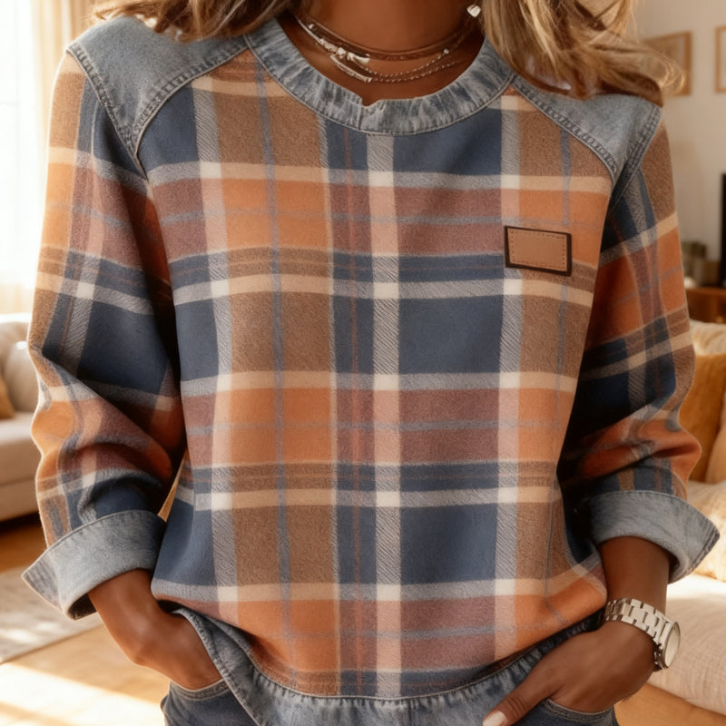 Paketet innehÄller: 1 * Damtröja i denim med lappteknik och rutmönster, lÄngÀrmad